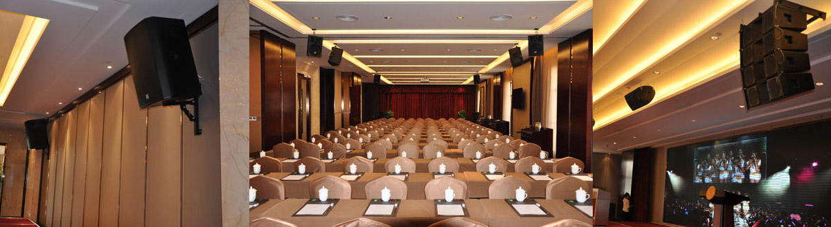 贝塔斯瑞品牌产品的扩声解决方案遍布酒店餐厅、多功能厅、会议室、贵宾接待室,共使用音箱36只,功放21台,周边设备17台及3G Audio 前级效果器4台。大型会议室主要设备有主扩MU15,低频扩展 MU18B,辅助扩声U12,配套功放R系列以及贝塔斯瑞电子周边设备;中型会议室、贵宾接待室、多功能会议室主扩则使用了HF121、R系列多通道功放、PX系列时序电源、3G Audio卡拉ok前级效果器DCM-2X等。