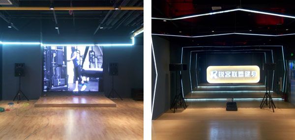 健身房音视频系统,最重要的是设计房间的声场均匀度和亮度,声音效果要求音质通透、动感、有张力,惊蛰音视为锐客联盟健身提供背景广播、操房、动感单车、大厅舞台扩声综合音响视频系统解决方案。